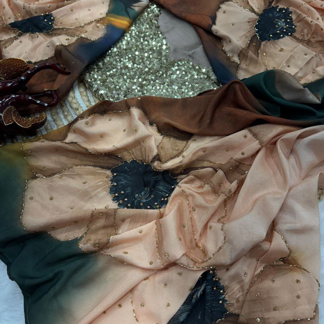 | Work | Beautiful floral print with katdana and pearls handwork |