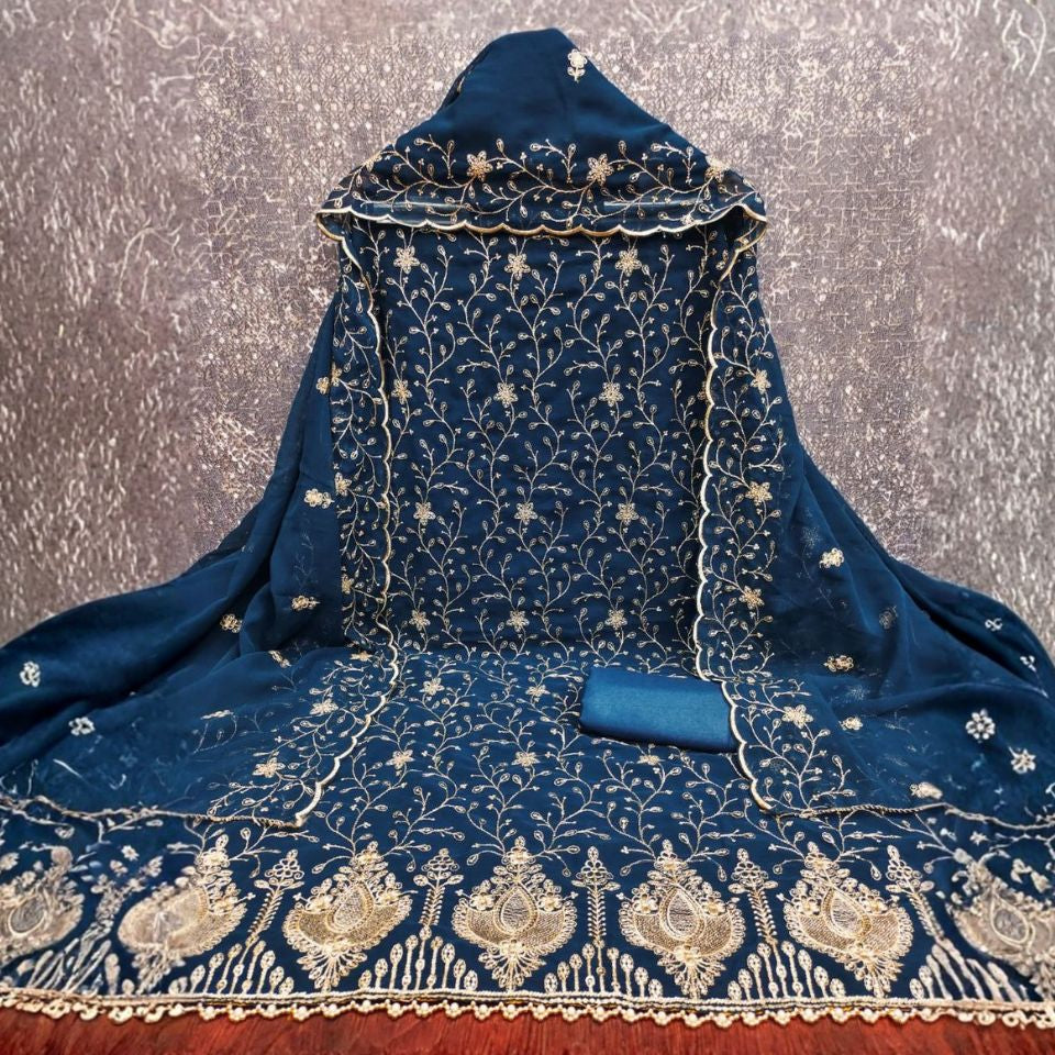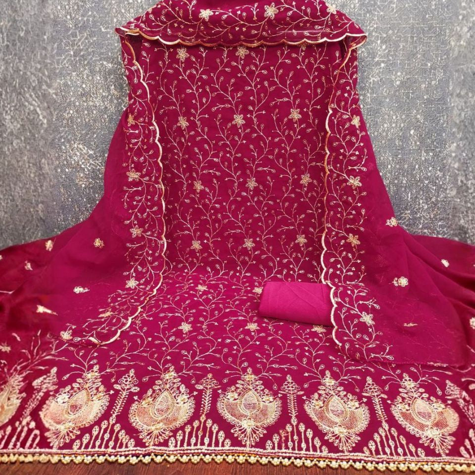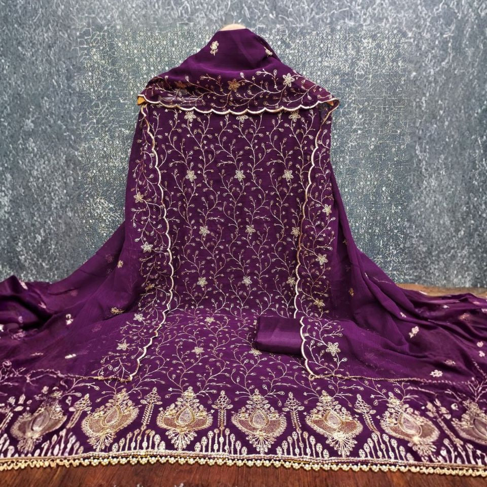 Crafted in Zamato fabric with fine Zari work and Jalar lace, this set comes with a heavy Santoon bottom and inner, paired with a matching Zari-work dupatta.