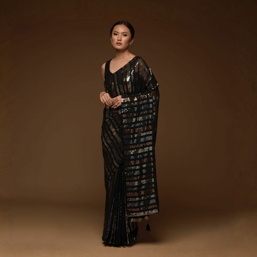 | Work | Beautiful triple sequence embroidery work in double run viscose thread with back patch border |