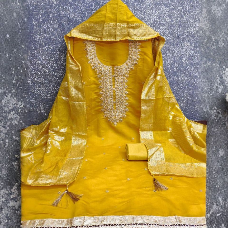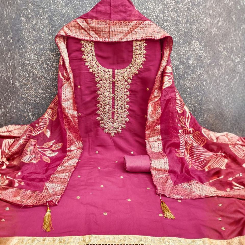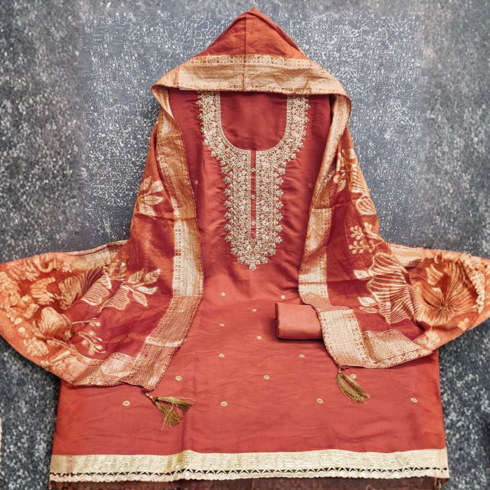 Made in PV Roman Silk with Kodding Sequins, paired with a Santoon bottom and Chanderi Silk Jacquard dupatta.