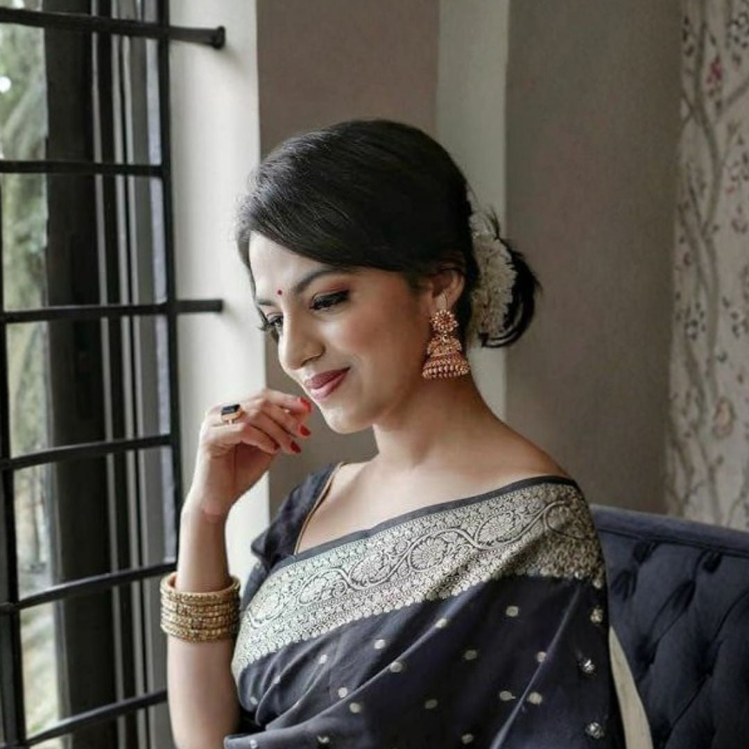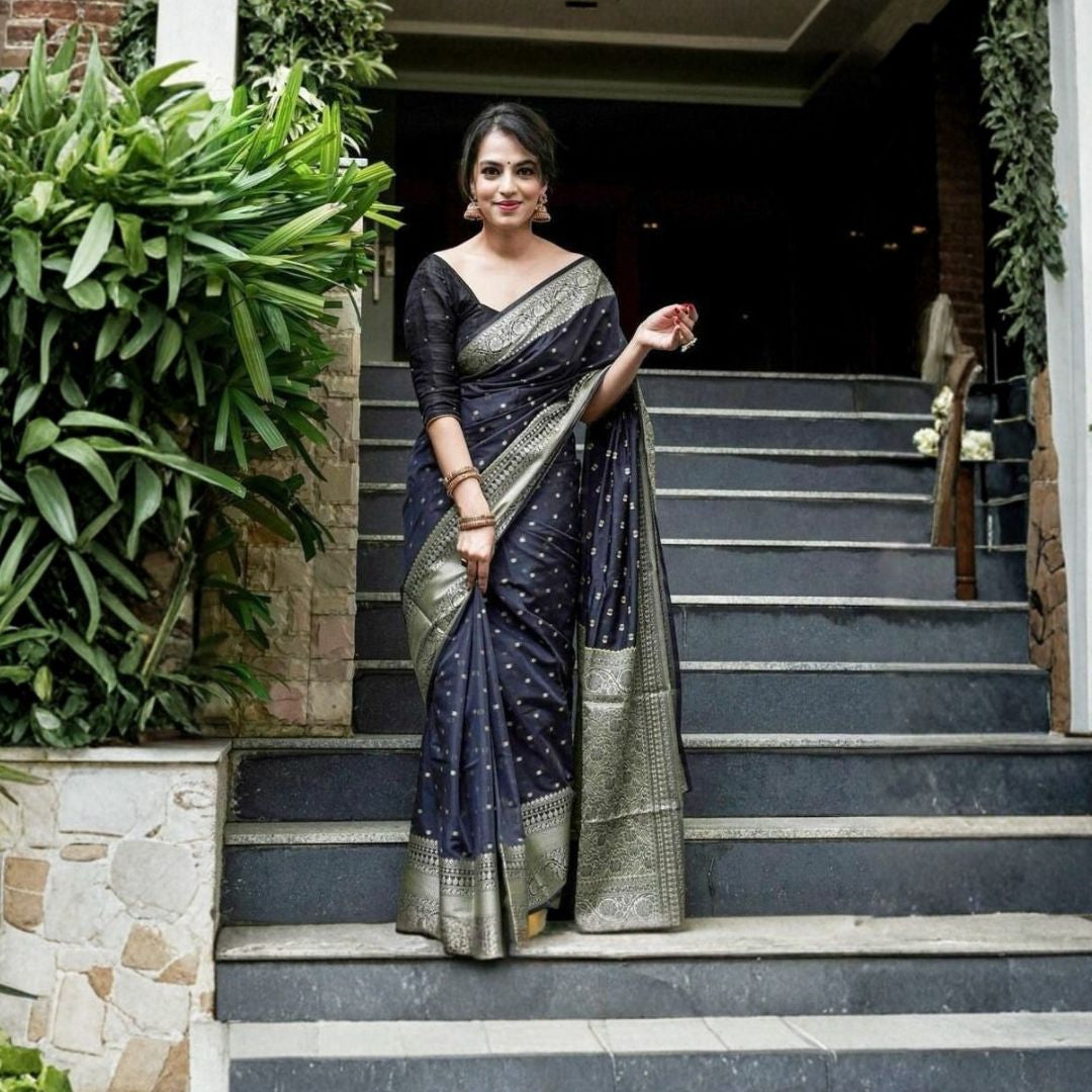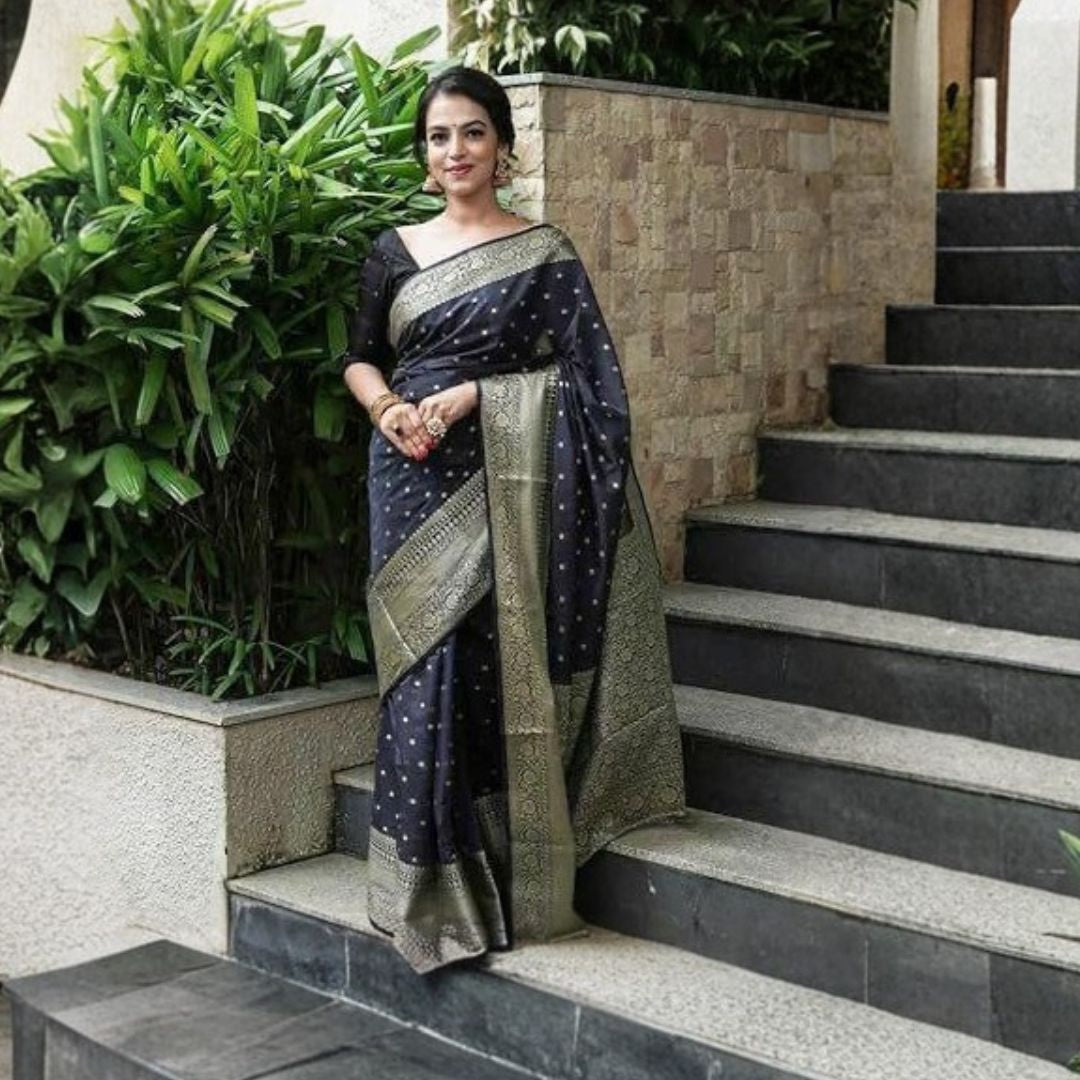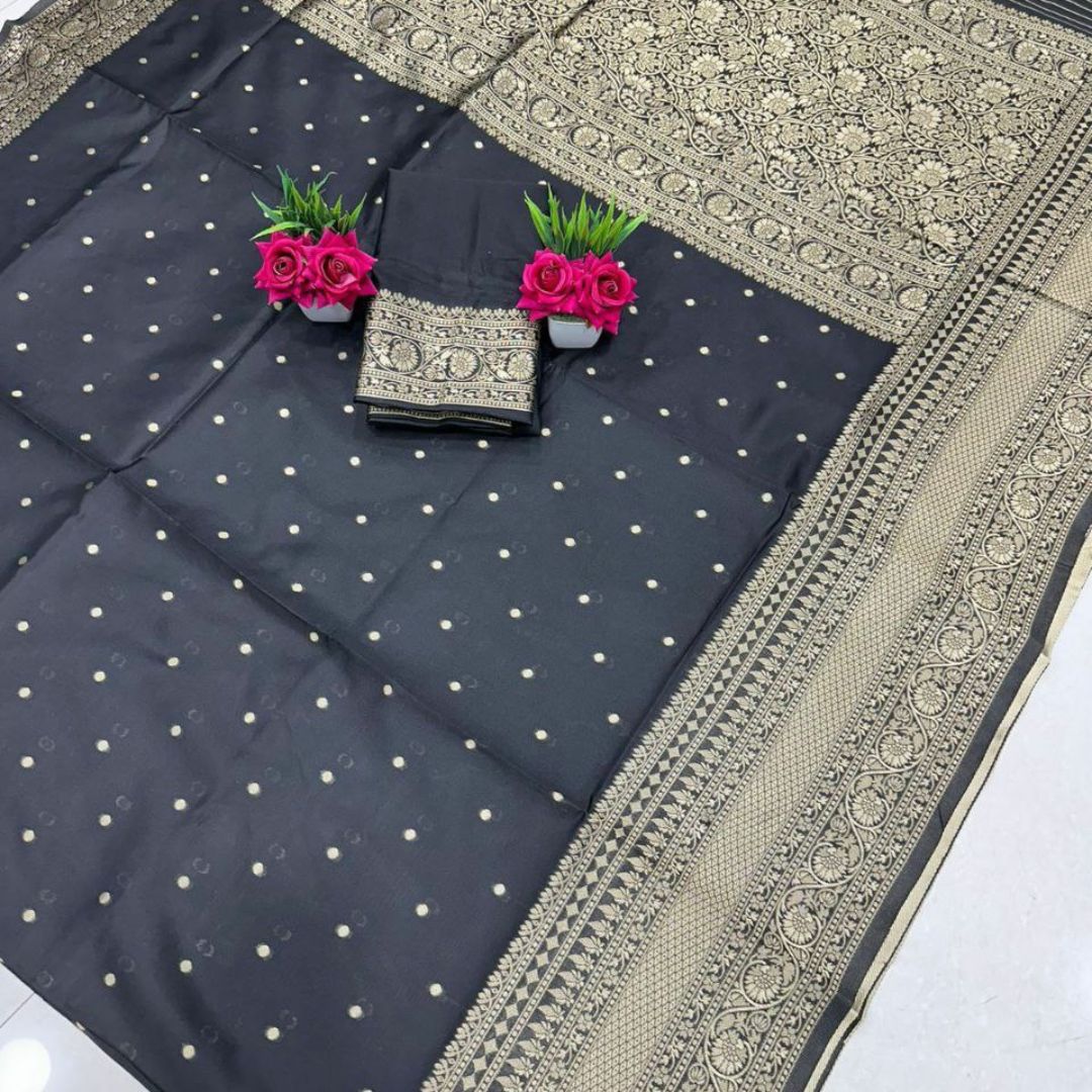 An elegant saree with a rich jacquard pallu and all-over woven patterns, paired with a contrast blouse featuring an exclusive jacquard border—perfect for festive and traditional occasions.